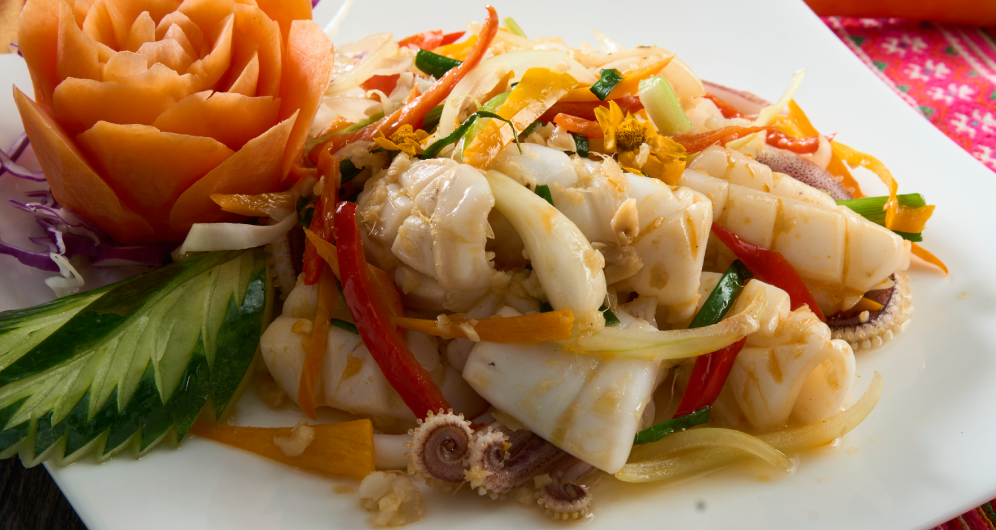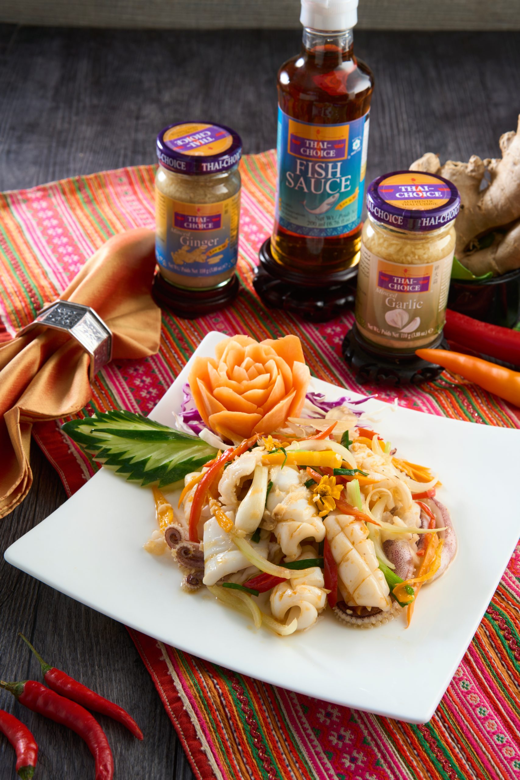 3. Add the squid and cook until just done, then add the diced onion, Thai-Choice Fish Sauce, sugar, water, and corn flour. Stir until well combined and thickened.